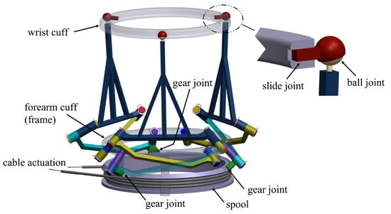 In the orthotics available on the market and those being developed and tested in research, cable-driven systems are frequently employed due to their reliability, weight advantages, and their ability to perform extrinsic actuation. Implemented as external tendons, cables are commonly used as a means of transmission to drive machine components, such as links or pulleys. Since they are only capable of pulling, a pair of cables that work antagonistically are used. In a prono-supination orthosis, cables can vary the lengths of the rods to cause wrist rotation [], or turn the wrist utilizing a C-shaped cuff along the forearm [,]. A pair of cables twisted around each other has been shown to produce high torques with low-speed movements []. Moreover, cables are frequently coupled with DC motors, providing significant weight and mobility advantages compared to pneumatic systems. As such, design decisions regarding the device under consideration in this paper are made to ensure it is conducive to being cable- and DC motor-driven.