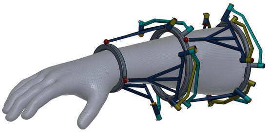 Limb deficiencies that impact autonomy reduce the capacity to perform activities of daily living and can require caregiver assistance [,]. Assistive orthoses are medical devices designed to support or assist the function of impaired limbs. Orthoses are typically worn externally and are customized to fit an individual’s unique body structure and needs. To optimize the functionality of a prono-supination orthosis, a rotation of the wrist relative to the elbow must be produced, with no components inside the forearm space, and with minimized size, power requirements, and weight. Multiple-degrees-of-freedom () wrist orthosis designs include those of Rocon et al. [] and Dezman et al. [].