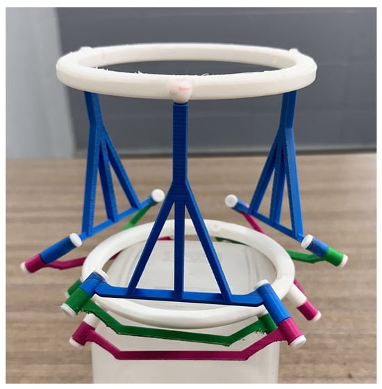 Proof-of-concept prototypes of the device generated in the prior section were constructed to confirm the range of motion, degrees of freedom, and transmission of loads. One version is shown in Figure 7, where the actuated pivot links, the driven pivoted links, and couplers are printed in pink, green and blue, respectively. This prototype was produced with a Bambu Lab (Shenzhen, China) A1 Mini printer. A nozzle size of 0.2 mm was used. The material is PLA, with a minimum elastic modulus of 2000 MPa and tensile strength of 31 MPa. The spherical mechanisms were scaled such that the inner diameter of the top ring was 60 mm. To achieve an acceptable operational fit within the revolute joints, the holes in the printed links were resized with a hand reamer and steel pins were inserted. White printed end caps were pressed onto the pins, as can be seen in Figure 7. Three ball joints joined the couplers to the top ring to serve as the orthotic wrist attachment. Those ball joints provide sufficient compliance to absorb the small structural errors in the synthesized mechanism. The ball joints on a functional orthosis would likely be produced from a turned aluminum ball and a socket molded from bearing-grade polymers. Additionally, the section size and material choice for the links would be optimized to balance rigidity and weight. The mechanical design details of the links and joint clearances that provide minimal freeplay remain for future work.