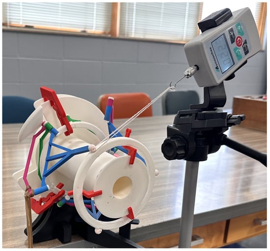 A force transmission test protocol was formulated that similarly set a mechanism configuration by precisely locating the top ring. At each set position, a weight W was hung from the moving end of one of the actuated links. The hanging weight produces a torque at the actuated joint of , where is the vector from to at the radius of the actuated link and is a unit vector representing the direction of gravity transformed for reorienting the device into the fixture. The torque on the actuated pivot axis is the third component of . A force gauge was positioned with a cord to restrain the motion of the top ring. Care was taken to position the cord tangentially to the ring, as seen in Figure 8. Thus, the restraining torque was , where is the radius of the top ring and is the force measured on the gauge. The test range was limited to due to interference between the hanging weight and the other links.