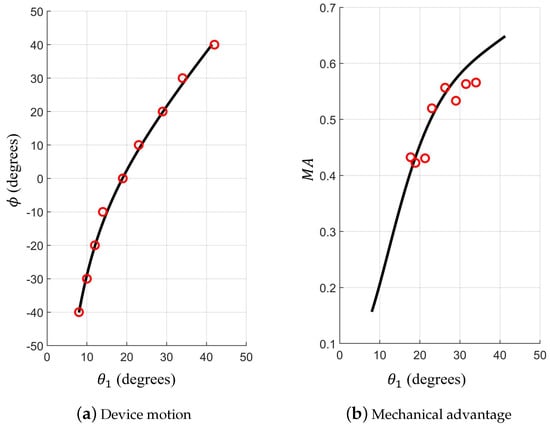 The fixture includes graduations to measure and . A motion test protocol was composed that located the actuated pivoted link within its operating range of . At each set position, was measured. A plot of vs. , derived from Equation (21), is shown in Figure 9a as the solid curve. The experimental evaluation of the prototype is shown via circular markers. The close match between the kinematic model and testing confirms the synthesis optimization results and the accuracy of the linkage parameters and joint construction.