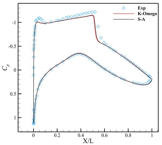 Figure 2 compares the numerically predicted wall pressure coefficients using different turbulence models with experimental data [28] (denoted as Exp). The analysis demonstrates good agreement between the wall pressure coefficients predicted by different turbulence models and experimental data. This consistency validates both the feasibility of the computational methodology and the reliability of the numerical results. Specifically, the Spalart–Allmaras turbulence model achieves higher consistency with experimental values at the shock location compared to the SST k-ω model. Based on this comparative performance, the Spalart–Allmaras model is adopted for subsequent simulations.