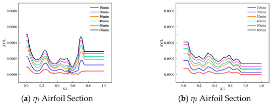 During the frost formation process via vapor deposition, the frost layer thickness on the upper surface of the airfoil was continuously monitored at two spanwise cross-sections (η1 = 60 mm and η2 = 30 mm from the wingtip) under each test case using 3D laser scanning technology throughout the 0~60 min sampling period. Four sets of experimental data under typical operating cases were analyzed: frost formation data for Case 1 (model temperature: 110 K, water vapor concentration: 6.45 ppm), Case 2 (model temperature: 110 K, water vapor concentration: 21.10 ppm), Case 3 (model temperature: 130 K, water vapor concentration: 19.07 ppm), and Case 4 (model temperature: 150 K, water vapor concentration: 20.19 ppm). Frost thickness distribution data were analyzed at six characteristic time points: 10 min, 20 min, 30 min, 40 min, 50 min, and 60 min. Missing values at specific measurement locations (caused by experimental errors) were replaced with frost thickness values from adjacent non-null data points.