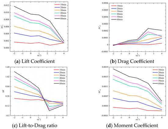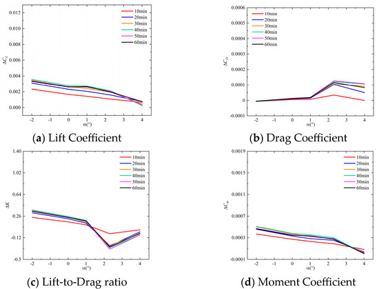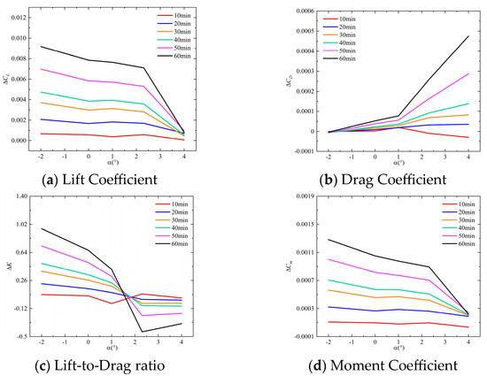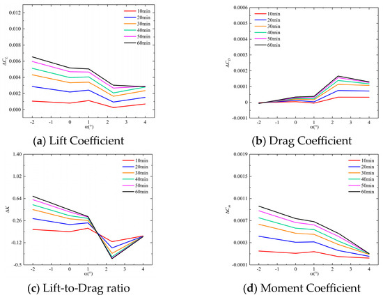 - ΔCD exhibits comparable variation trends with the angle of attack across both cases. During the angle of attack increase from −2° to 2.31°, a consistent ascending tendency in ΔCD is observed. Furthermore, the variation patterns of ΔCD demonstrate similar consistency with increasing frost accretion duration under both conditions.