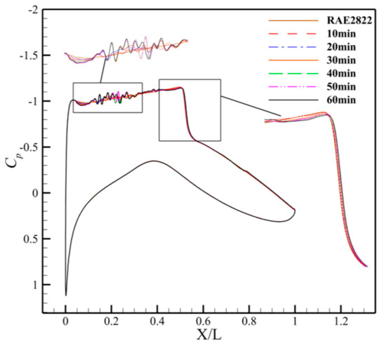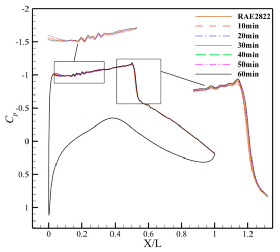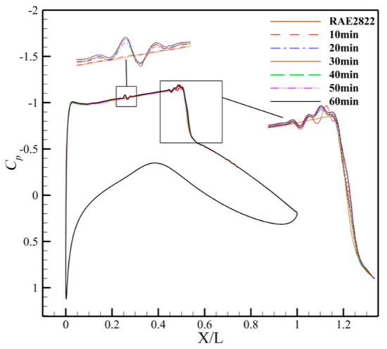 Numerical simulations were conducted on RAE2822 baseline airfoil grids with three distinct grid configurations under incoming flow conditions of Ma = 0.729, angle of attack (α) 2.31°, and freestream temperature 255.56 K. The converged numerical results of lift coefficient (CD), drag coefficient (CD), and pitching moment coefficient (Cm, referenced about the airfoil leading edge) for the three grid configurations are tabulated in Table 2. By using the numerical simulation results of the dense grids as the reference, the relative errors of the findings for the sparse and medium grids are analyzed. The maximum relative error between medium and fine grid solutions is quantified at 0.14%, while the coarse grid exhibits a 3.79% maximum discrepancy specifically in drag coefficient prediction. With all three grid configurations demonstrating errors below the 4% threshold, these results confirm that grid resolution exerts minimal influence on the numerical simulation outcomes. Considering computational resource allocation, computational efficiency, and numerical accuracy, the medium grid was selected as the meshing strategy for this study.