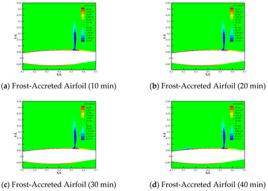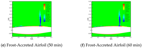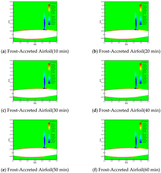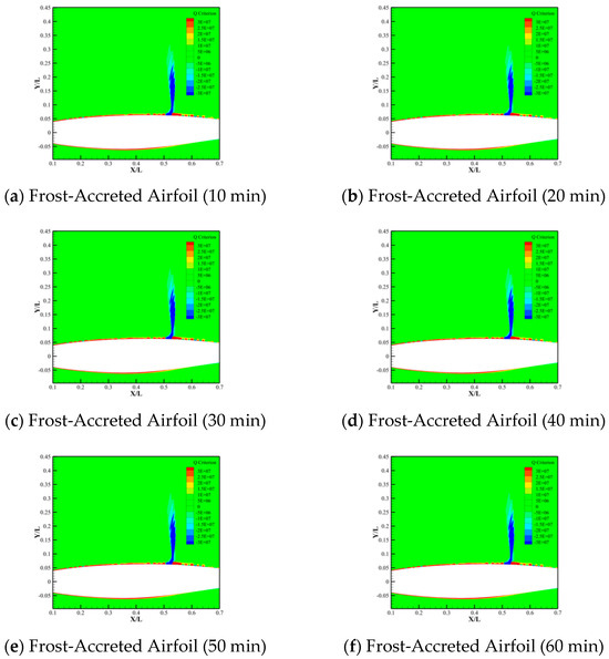 Vorticity quantifies the rotational characteristics of fluid motion, defining both the magnitude and direction of velocity field circulation to characterize the intensity and spatial orientation of fluid rotation. In vortex identification methodologies, three prevalent criteria are widely adopted: the Q criterion [29], the λ2 criterion [30], and the Ω criterion [31]. The Q criterion demonstrates broad applicability in fluid dynamic analyses, with implementation advantages stemming from its simplicity and computational efficiency relative to alternative vortex identification methodologies. To further explore the flow field modifications induced by frost accretion, Q criterion contours of both baseline and frost-accreted airfoils at chordwise positions X/L = 0.1~0.7 are comparatively presented in Figure 17. With increasing frost accretion duration, three critical flow modifications are observed: progressive destabilization of the pre-shock flow downstream of X/L = 0.28; slight rearward migration of the shock wave position; and the flow field behind the shock wave undergoes a considerable alteration. This is because the profile change on the airfoil’s upper surface grows as the duration and thickness of frost accretion increase. This alters the flow structure on the airfoil’s surface.