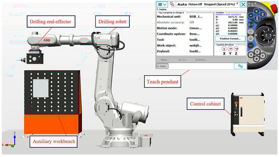 The workstation of the robot drilling system includes a drilling robot and peripheral equipment such as the drilling end-effector, auxiliary workbench, control cabinet and teach pendant, as shown in Figure 1.