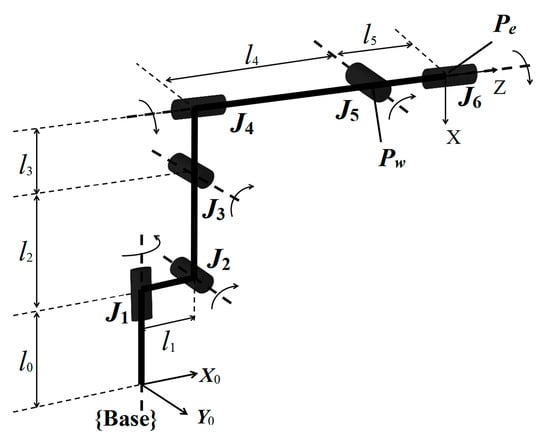 where , is the three-dimensional angular velocity and linear velocity at the robot end, ( = 1, 2, 3 …,6) represents the -th joint movement of the robot and is the -th joint angular velocity.