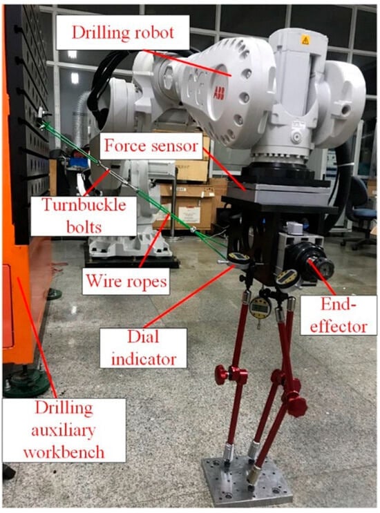 In order to verify the established stiffness model of the robot drilling system, the experimental setup is shown in Figure 5. The experimental setup is mainly composed of a drilling robot, an end-effector, the turnbuckle bolts and wire ropes, a force sensor, three dial indicators, and a drilling auxiliary workbench.