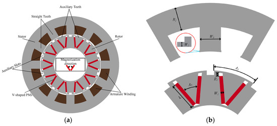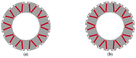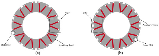 Position of rotor auxiliary teeth: (a) V-shaped PM is aligned with an auxiliary tooth (V2T); (b) V-shaped PM is aligned with a rotor slot (V2S).