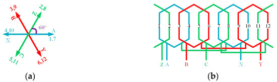 Winding connection: (a) slot EMF star diagram; (b) winding layout.