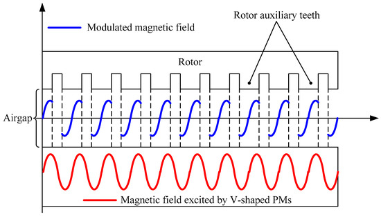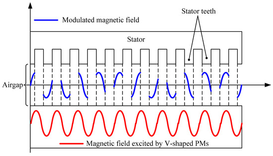 Firstly, consider the field harmonics yielded when the magnetic field excited by the V-shaped magnets undergoes the FME of the stator teeth. As shown in Figure 3, since the magnetic permeance of the stator teeth is significantly higher than that of the stator slots, the magnetic field produced by the PMs easily passes through the stator teeth but hardly penetrates the stator slots. Consequently, the waveform segments aligned with the stator teeth are preserved, while those aligned with the stator slots are attenuated. Thus, the magnetic field generated by the magnets is modulated by the stator teeth into the magnetic field indicated by the blue color. By applying Fourier series expansion to the modulated magnetic field waveform, numerous field harmonics can be observed. According to the “magnetic gear effect”, the PPN of the modulated field harmonics is given by the following equation [56,57]: