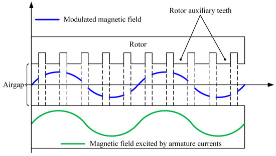 Schematic diagram: Armature magnetic field modulated by rotor auxiliary teeth.
