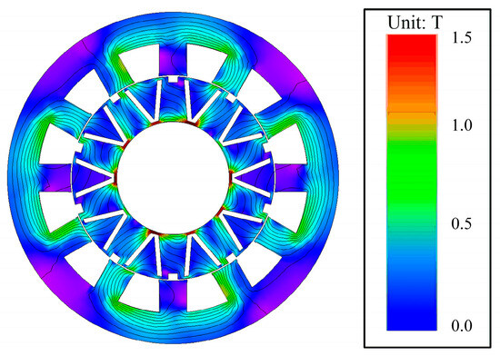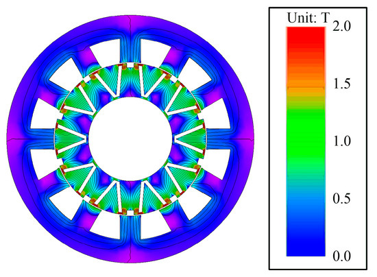 To elucidate the working principle of the proposed RAT-PMVM, the radial airgap flux density resulting from field modulation effect is separately obtained for both PM and armature fields in transient magnetic field by using JMAG software (Version 23) for the 2D finite element method (FEM). Figure 7 illustrates the magnetic field distribution generated by V-shaped magnets. As can be seen, there are four flux envelope loops in the motor, indicating that the magnetic field generated by the ten-pole-pair magnets manifests as a two-pole-pair field under the combined action of the stator teeth and rotor auxiliary teeth. Figure 8 displays the radial airgap flux density waveform excited by V-shaped magnets and the corresponding FFT spectrum. Evidently, the waveform in Figure 8a exhibits non-sinusoidal characteristics attributable to the FME induced by stator teeth and RAT. As can be seen from Figure 8b, the spectrum contains multiple harmonics: the fundamental harmonic of PPN = 10 originates from the V-shaped PMs, whereas the field harmonic of PPN = 2 results from FME of the stator teeth. Since the pole-pair number of this field harmonic (PPN = 2) matches that of the three-phase armature windings (Pw = 2), and its rotational speed synchronizes with the armature current’s rotating magnetic field, stable torque is produced via interaction of this harmonic component with PPN = 2 with armature currents’ fundamental magnetic field (PPN = 2).