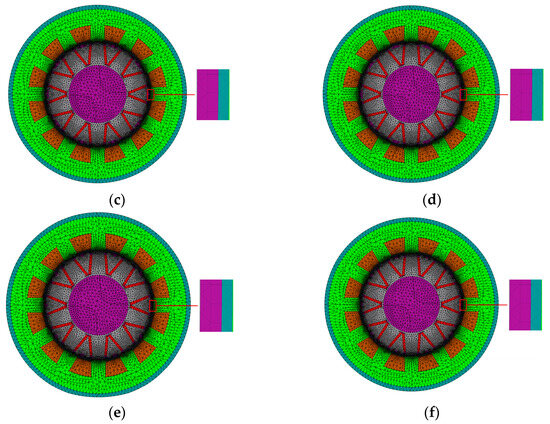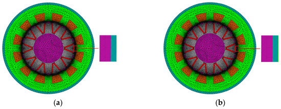 This section comparatively studies the influence of rotor auxiliary tooth count on the electromagnetic performance of the RAT-PMVM in a transient magnetic field by using 2D FEM. Figure 11 shows two rotor configurations with different rotor auxiliary tooth numbers. The rotor in Figure 11a has 10 rotor auxiliary teeth, while the rotor in Figure 11b has 20 rotor auxiliary teeth. For clarity, the PMVM with 20 rotor auxiliary teeth is denoted as multi-tooth RAT-PMVM (MRAT-PMVM), while that with 10 rotor auxiliary teeth is still designated as RAT-PMVM. As shown in Figure 12, two-dimensional finite element mesh models were established, with three layers of mesh generated in the airgap region for both models. Figure 12a shows the mesh model of the RAT-PMVM, with the number of elements and nodes being 27,086 and 14,777, respectively. Figure 12b shows the mesh model of the MRAT-PMVM, with the number of elements and nodes being 26,338 and 14,403, respectively. The average mesh quality provided by JMAG software (Version 23) is approximately 0.75 for both models (where the optimal mesh quality in this software corresponds to 1). The time step was set to approximately 0.192 ms for all simulations. Note that the basic parameters of the two motors except auxiliary tooth count are exactly the same as those in Table 1.