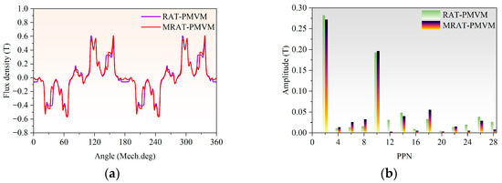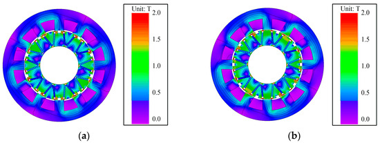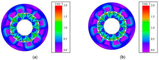 Magnetic field distribution at rated conditions: (a) RAT-PMVM; (b) MRAT-PMVM.