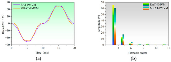 Figure 15 compares the Back-EMF of RAT-PMVM and MRAT-PMVM at the rated speed. As observed in Figure 15a, the Back-EMF period is consistently 20 ms for both PMVMs. Figure 15b demonstrates that RAT-PMVM exhibits a significantly higher fundamental Back-EMF amplitude than MRAT-PMVM, along with a lower total harmonic distortion (THD) of 15% versus 21.8% for MRAT-PMVM.