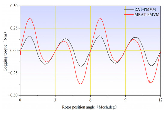 Figure 16 compares the cogging torque of RAT-PMVM and MRAT-PMVM. As evidenced, RAT-PMVM exhibits a cogging torque period of 3° versus 6° for MRAT-PMVM, with peak values measuring 0.16 Nm and 0.36 Nm, respectively. Notably, RAT-PMVM achieved a 55.6% reduction in peak value of cogging torque compared to MRAT-PMVM.