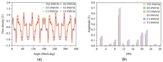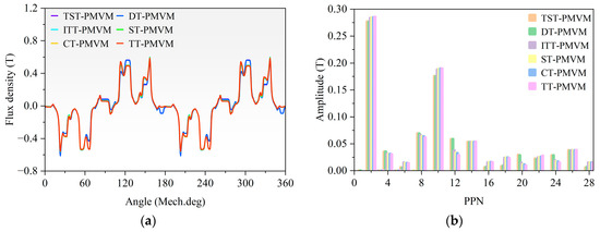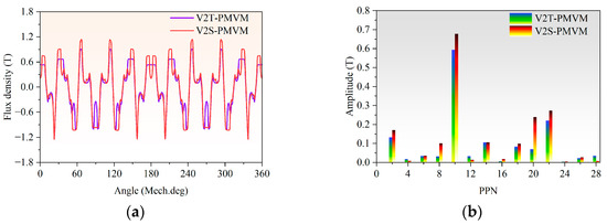 Comparison of airgap flux density excited by V-shaped magnets in V2T-PMVM and V2S-PMVM: (a) waveforms; (b) FFT spectra.