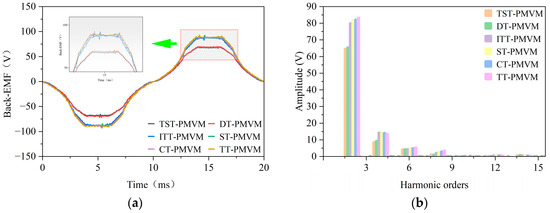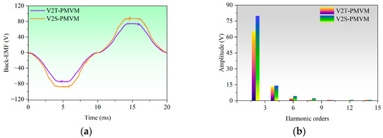 Back-EMF comparison between V2T-PMVM and V2S-PMVM: (a) waveforms; (b) spectra.