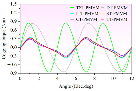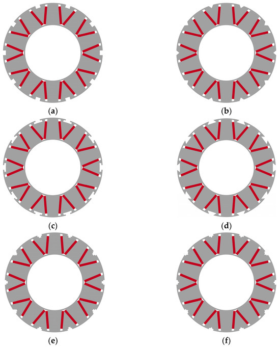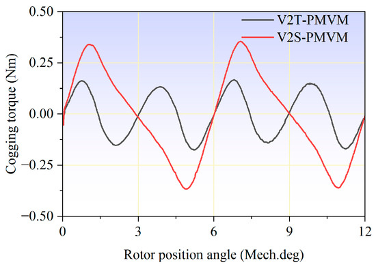 Cogging torque remains a critical electromagnetic performance in PM machines, including PMVMs. Several techniques have been developed to mitigate cogging torque. For instance, Ref. [35] comprehensively reviewed skewing techniques for cogging torque suppression in permanent magnet synchronous motors (PMSMs), including continuous skew, step skew, and notch skew. Ref. [36] comprehensively investigated and evaluated the cogging torque suppression techniques of flux-switching permanent magnet machines, such as skewing stator, skewing rotor, step-skewing rotor, asymmetric stator and rotor structures, the successively shifting and alternately shifting rotor teeth techniques, pairing rotor, chamfering, and tooth notching. Ref. [37] adopted auxiliary slots on the rotor to minimize the cogging torque of V-type interior PMSMs. Ref. [38] proposed a method to reduce cogging torque in PM machines by shifting the elementary-cogging unit. Ref. [39] designed, analyzed, and fabricated a fully coreless axial-flux PM generator for eliminating cogging torque and eddy current losses, enhancing efficiency. Ref. [40] pointed out that cogging torque can be mitigated by increasing the least common multiple of the slot–pole combinations. Refs. [41,42] presented tooth-shaping methods to reduce the cogging torque of axial-flux PM machines. Refs. [43,44] minimized cogging torque by designing proper magnet shapes. Ref. [45] applied a magnet-shifting design for a PMVM to reduce cogging torque as well as torque ripples. Ref. [46] employed the design of non-uniform tooth distribution in PMVM to reduce cogging torque and enhance output torque.