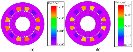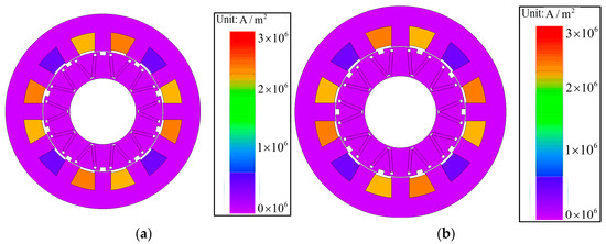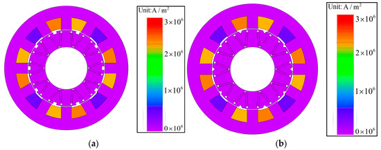 Current density distribution at rated conditions: (a) RAT-PMVM; (b) MRAT-PMVM.