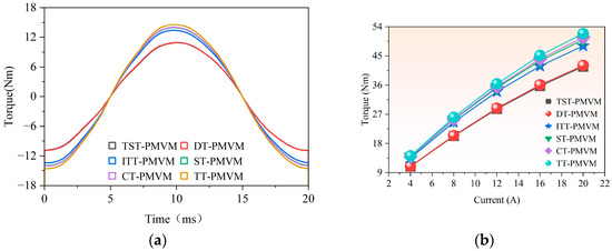 Figure 17 compares the torque performance of the RAT-PMVM and MRAT-PMVM. Figure 17a displays the blocking torque curve during one electrical cycle under locked-rotor conditions (0 rpm) and rated current (I = 4 A), representing maximum torque output capability under the rated phase current. As can be seen, RAT-PMVM demonstrates superior torque output capability over MRAT-PMVM under the rated phase current. Figure 17b illustrates average torque versus current characteristics for both PMVMs. As current increases, the RAT-PMVM consistently generates higher average torque than the MRAT-PMVM.