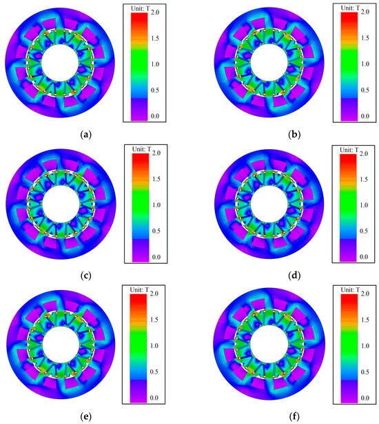 Figure 9 exhibits the magnetic field distribution generated by three-phase armature currents. The number of flux envelopes also shows that the armature field manifests as a two-pole-pair field due to the stator and rotor auxiliary teeth, matching the pole-pair number of the three-phase armature windings exactly. Figure 10 displays the radial airgap flux density waveform excited by three-phase armature currents and the corresponding FFT spectrum. The waveform in Figure 10a exhibits significant non-sinusoidal distortion, confirming abundant harmonic content induced by FME generated through combined stator teeth and RAT interaction. As Figure 10b demonstrates, the fundamental magnetic field (PPN = 2) originates from the three-phase armature currents, whereas the field harmonic of PPN = 10 results from FME generated through combined stator teeth and RAT interaction. Since this harmonic’s pole-pair number (PPN = 10) matches that of the V-shaped magnets (Pr = 10) and its rotational speed synchronizes with the rotor, stable torque is produced through the interaction of this harmonic component with PPN = 10 with V-shaped PMs’ fundamental magnetic field (Pr = 10).
