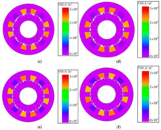 Figure 47 and Figure 48 display the magnetic field distribution and current density distribution of the TT-PMVM before and after optimization under rated conditions, respectively. As can be seen from Figure 47, the saturation level of the TT-PMVM under rated conditions is comparable before and after optimization. However, by comparing the number of leakage flux lines at the stator slots, it is observed that the leakage flux is reduced after optimization. As can be seen from Figure 48, the maximum current density of the optimized motor does not exceed 4 A/mm2 under rated conditions. Thus, the steady-state temperature rise remains within acceptable limits after optimization.