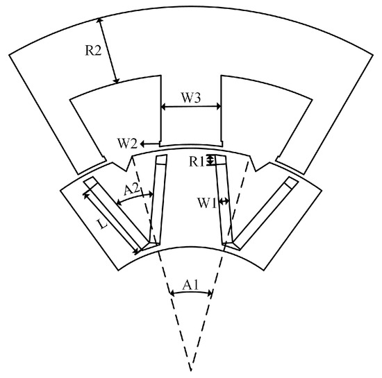 The working principle of the PMVM is based on the field modulation effect (FME) [8], which allows the design of the pole-pair number (PPN) of the armature windings to differ from the PPN of the rotor magnets, while also enabling torque generation by harnessing rich magnetic field harmonics. Recent research efforts have focused on improving the electromagnetic performance of PMVMs through developing novel topologies or optimizing existing ones. For example, Ref. [9] designed a surface-mounted PMVM to make a good compromise between torque density and power factor through constructing closed-form per-unit equations. Ref. [10] proposed a five-phase fault-tolerant interior PMVM for high reliability and high torque density at low speed. Ref. [11] designed and analyzed a consequent-pole PMVM to reduce PM material cost, cancel even-order harmonics, and achieve high torque density. Ref. [12] proposed a new PMVM with both yoke PMs and slot PMs on stator for torque enhancement. Ref. [13] developed and analyzed a V-shaped PMVM with dummy slots in the rotor for reducing flux leakage, enhancing the output torque, and suppressing the torque ripple. Ref. [14] presented a novel fractional-slot H-shaped PMVM to enhance torque density and decrease cogging torque. Ref. [15] designed a special L-shaped PMVM to reduce the leakage flux lines in the end portion of the PMs, which enhanced flux linkage and power factor. Ref. [16] proposed a novel design of PMVM with a T-shaped consequent pole rotor, which can increase fundamental airgap flux density, PM utilization ratio, and output torque. Ref. [17] presented a PMVM with saddle-shaped PMs to improve torque and reduce torque ripple. Ref. [18] designed and analyzed two five-segment Halbach-array PMVMs with two different slot/pole combinations to achieve a high torque density with an acceptable power factor, while maintaining a low torque ripple. Ref. [19] developed a spoke-array PMVM with magnets bridge, which can effectively restrict the flux barrier effect and improve electromagnetic performance. Ref. [20] proposed a spoke-type PMVM with an unaligned stator auxiliary teeth arrangement to significantly enhance the field modulation effect, back-electromotive force (Back-EMF), and electromagnetic torque. Ref. [21] explored a consequent-pole K-shaped PMVM, which has the advantages of spoke- and V-shaped magnetic arrangements. Ref. [22] proposed a PMVM with coding-shaped teeth, which can introduce permeance harmonics with a specific phase and amplitude to ensure that modulating flux fields contribute to the torque output. Ref. [23] developed a PMVM with an unequal stator modulated teeth structure to reduce electromagnetic vibration. Ref. [24] proposed a straight-tooth PMVM with Halbach-array magnets in a stator slot opening to improve Back-EMF and power factor. Ref. [25] comparatively analyzed two split-tooth PMVMs with evenly and unevenly distributed modulation teeth, and the results verify that the PMVM with unevenly distributed modulation teeth outperforms the one with evenly distributed modulation teeth. Ref. [26] developed a consequent-pole PMVM with an uneven distribution of armature teeth and fault tolerant teeth to generate asymmetric airgap field distribution, improve its working harmonics, and reduce PM consumption. Ref. [27] explored a PMVM with specially designed stator auxiliary teeth, which can achieve higher torque density than that of a regular nonoverlapping winding PMVM with the same magnet usage. Ref. [28] proposed a V-shaped PMVM with unequal-width stator slots for cogging torque and torque ripple suppression, while the desired torque output capability is maintained. Ref. [29] designed and analyzed a PMVM with an asymmetric-stator-pole configuration, which introduces the consequent-pole structure, auxiliary slots, Halbach array, and overhang structure to improve the PM utilization and torque density. In terms of optimization, Ref. [30] employed a multi-objective genetic algorithm to optimize the V-shaped PMVM, enhancing torque density and reducing torque ripple. Ref. [31] was devoted to identifying the optimal pole ratio of a spoke-type PMVM by equivalent magnetic circuit model. Ref. [32] efficiently and accurately optimized a spoke-type PMVM by leveraging multi-level sensitivity analysis, approximate model, and multi-objective genetic algorithm to enhance torque density and power factor. Ref. [33] optimized a spoke-type PMVM accounting for eccentric pole-arc shape by an analytical method. Ref. [34] used a novel numerical model to optimize the output torque, torque ripple, efficiency, and power factor of a PMVM.