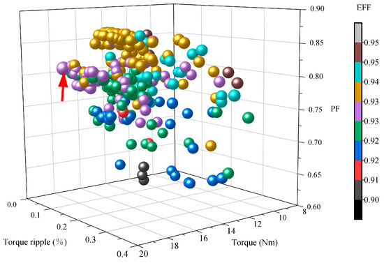 Table 8 compares the other electromagnetic performances of the TT-PMVM before and after optimization. Beyond output torque enhancement and torque ripple reduction, the efficiency (EFF) of the optimized TT-PMVM increases from 92.2% to 93.0% (+0.8%), while the power factor (PF) improves from 0.73 to 0.81 (+11.0%).
