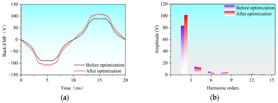 Back-EMF of TT-PMVM before and after optimization at 300 rpm: (a) waveforms; (b) spectra.