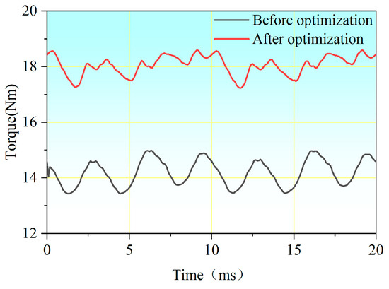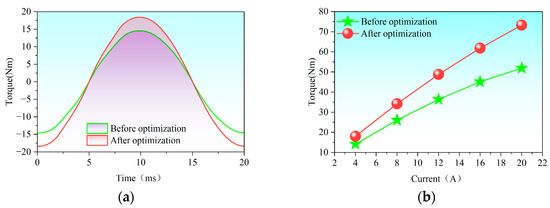 Figure 45 compares torque performance of TT-PMVM before and after optimization. Figure 45a displays the blocking torque curve during one electrical cycle under locked-rotor conditions (0 rpm) and rated current (I = 4 A). Clearly, the optimized TT-PMVM exhibits increased torque output capability. Figure 45b illustrates the average torque versus current characteristics of TT-PMVM before and after optimization. As the current increases, the optimized TT-PMVM generates higher average torque. Figure 46 compares the rated output torque of the TT-PMVM before and after optimization. The optimized TT-PMVM demonstrates a 27.3% increase in average torque (14.19 Nm → 18.06 Nm), while the torque ripple ratio decreases by 31.8% (11.0% → 7.5%).
