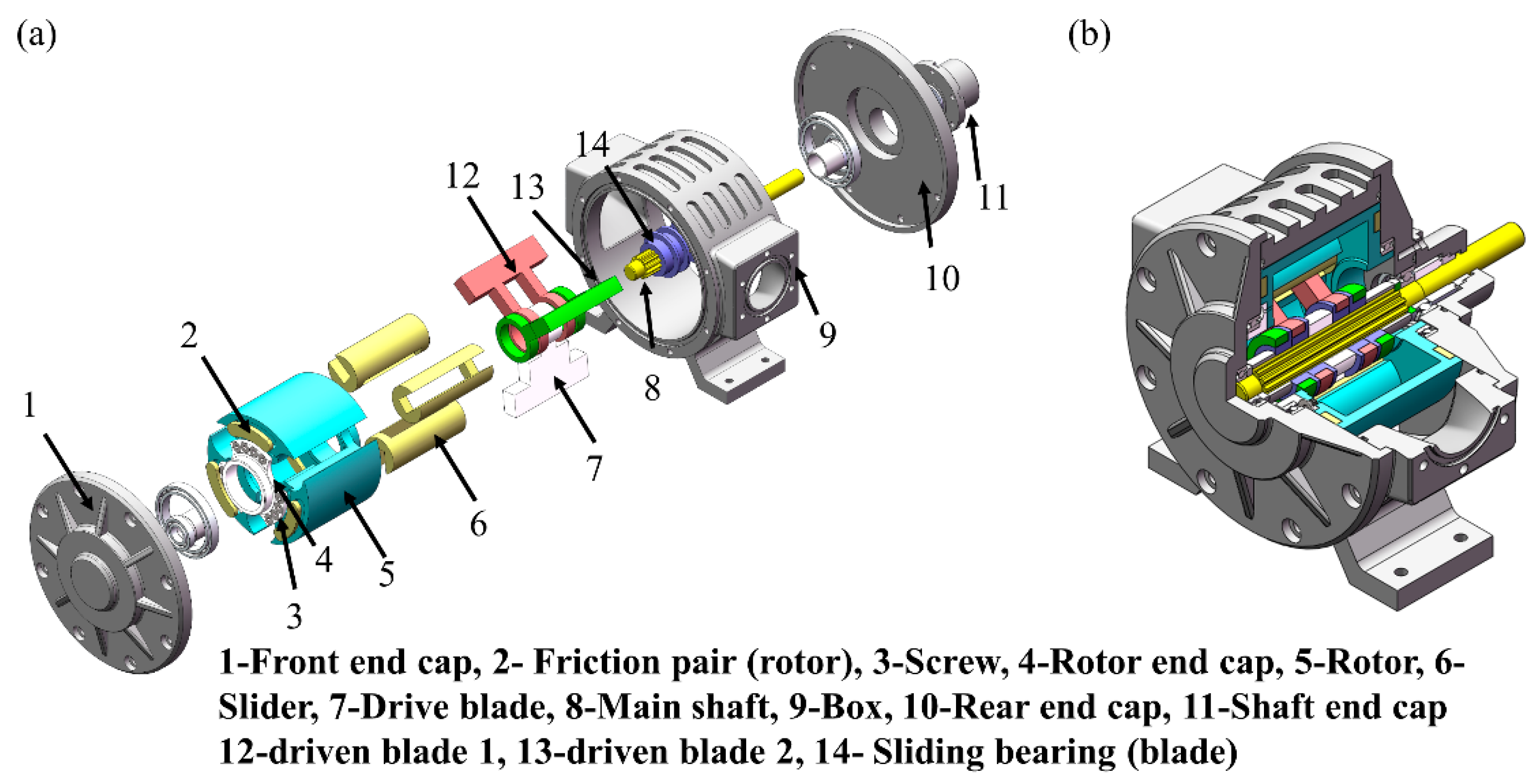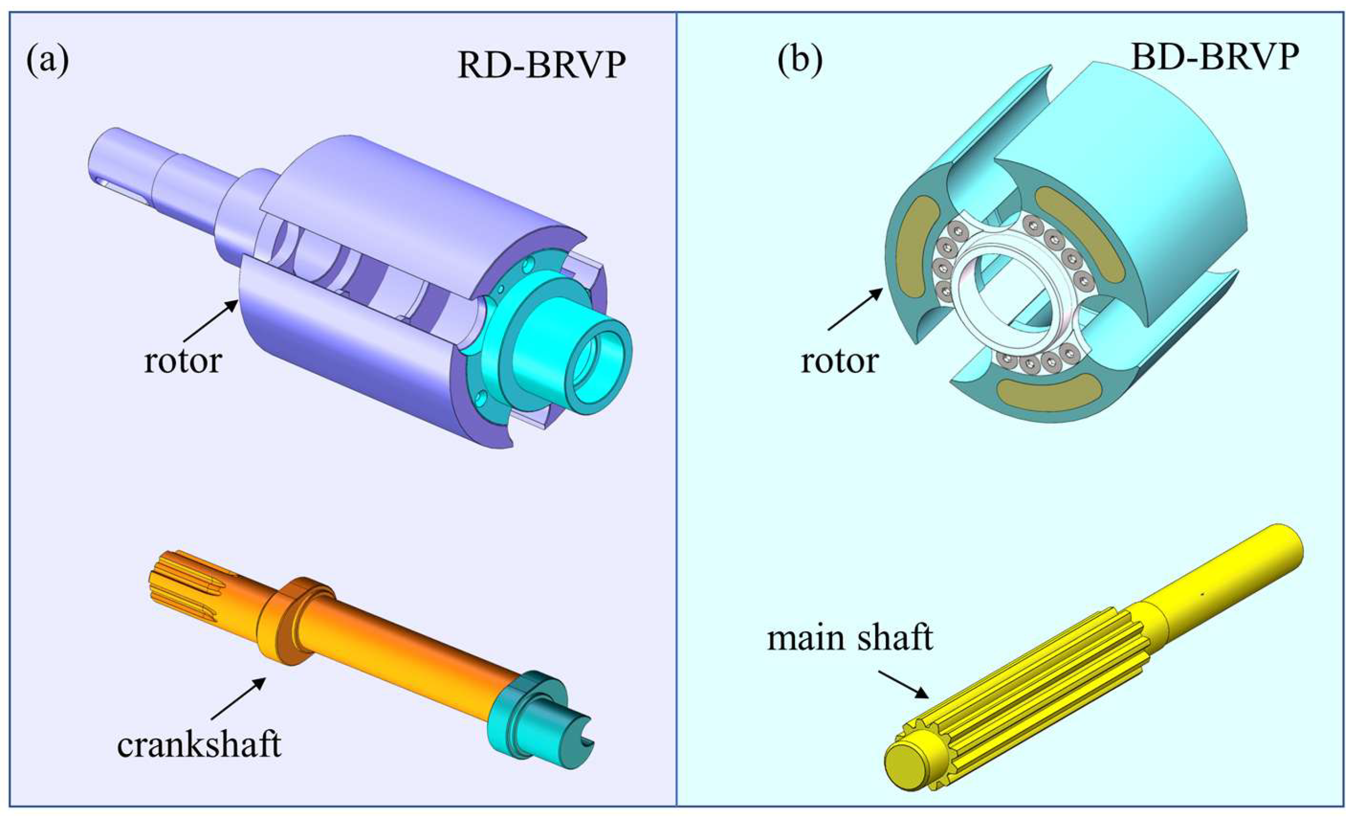 Structural differences between the rotor and main shaft in both configurations: (a) BD-BRVP; (b) RD-BRVP.