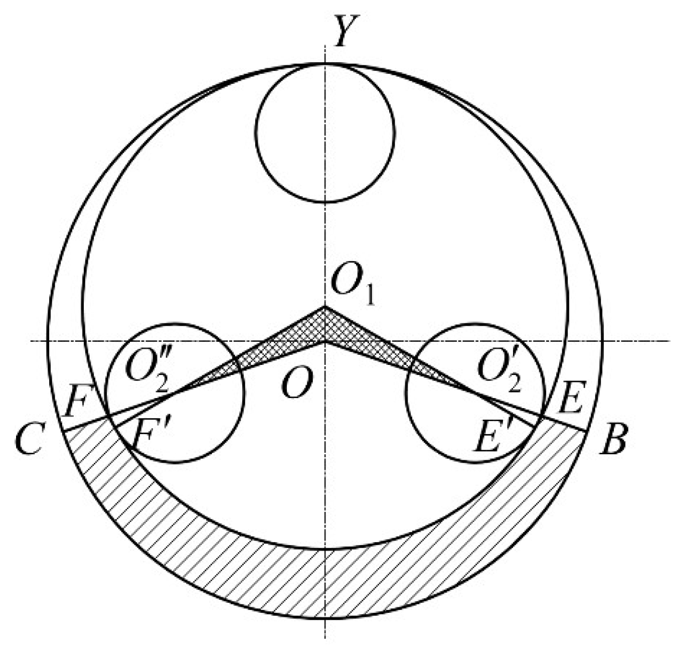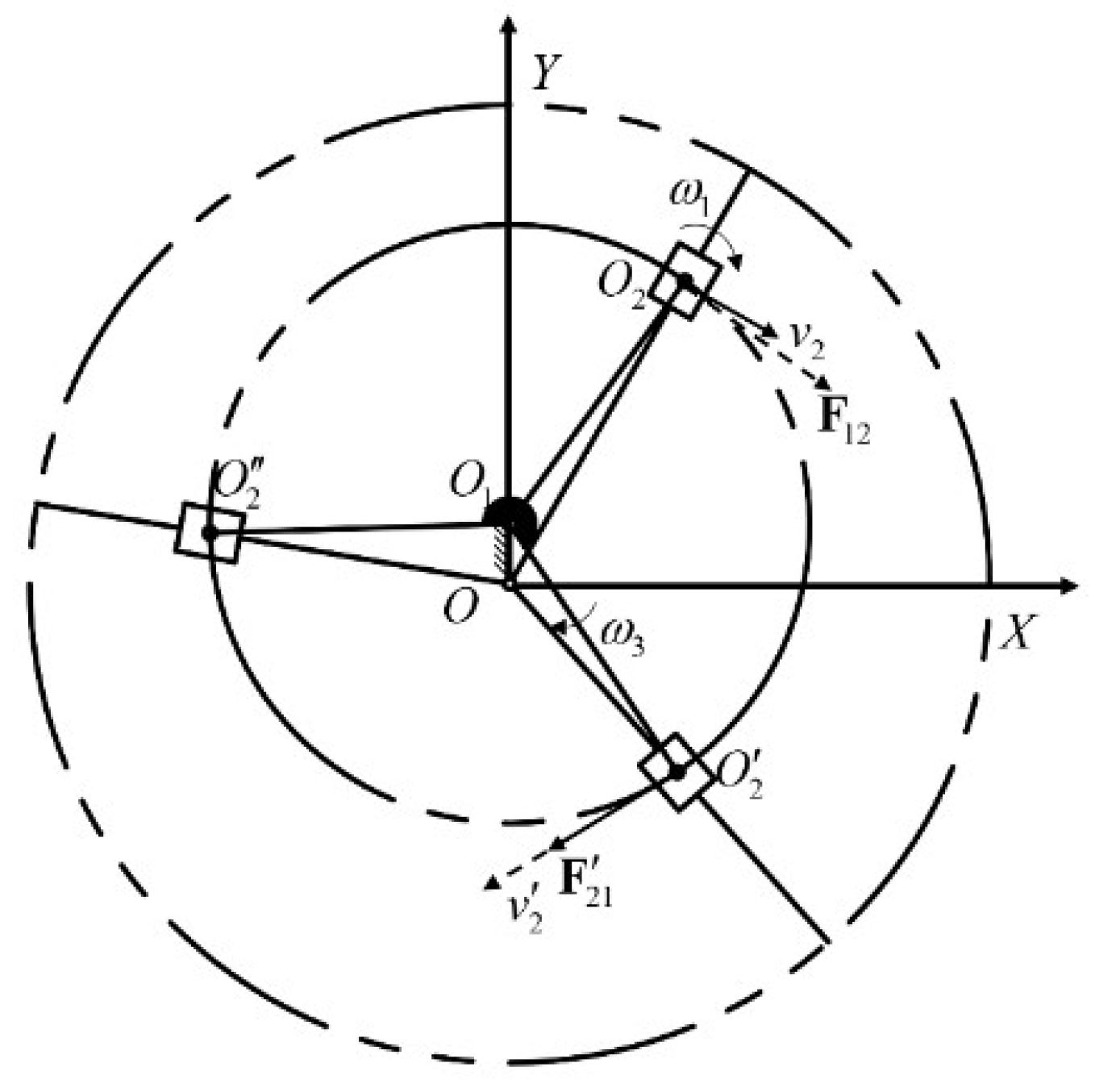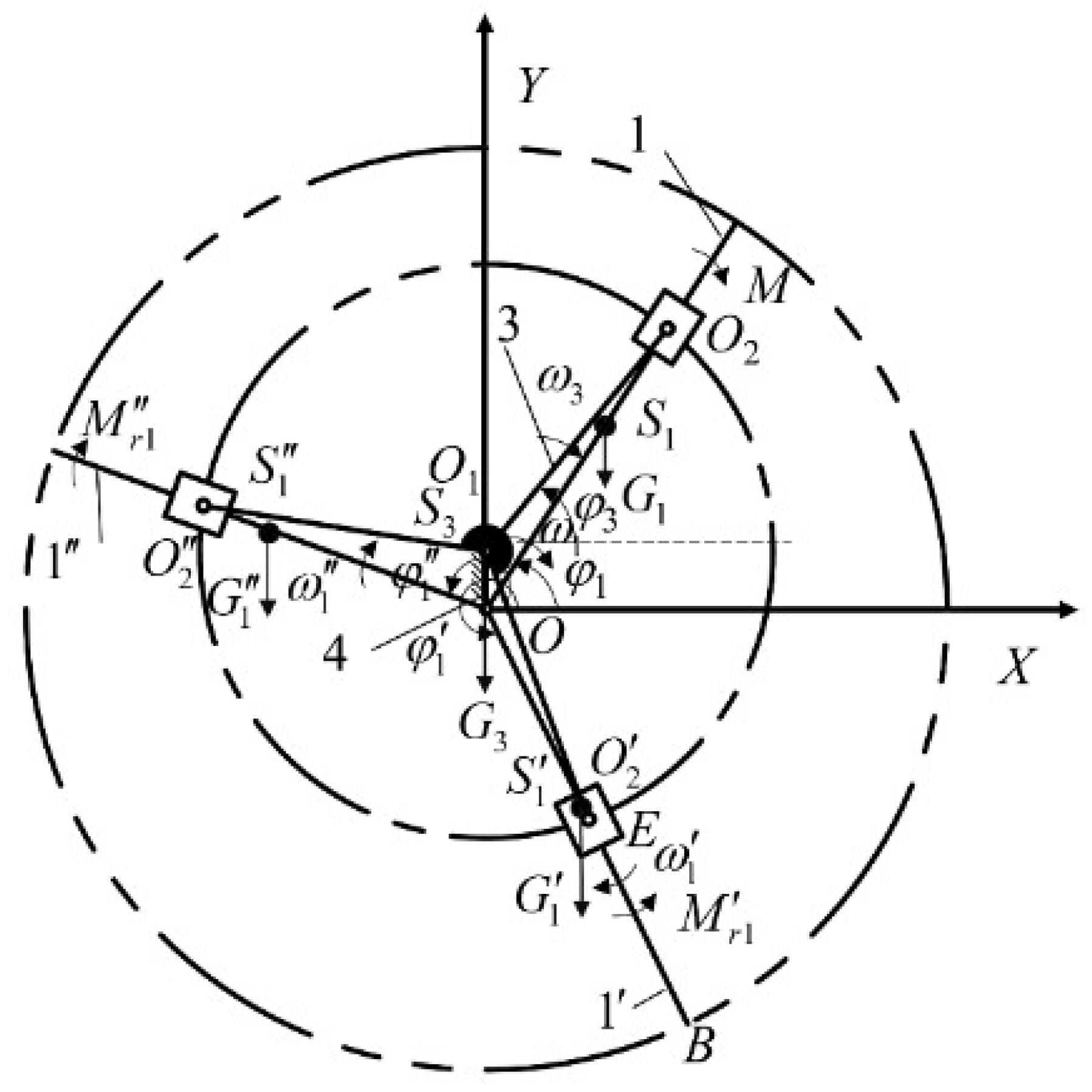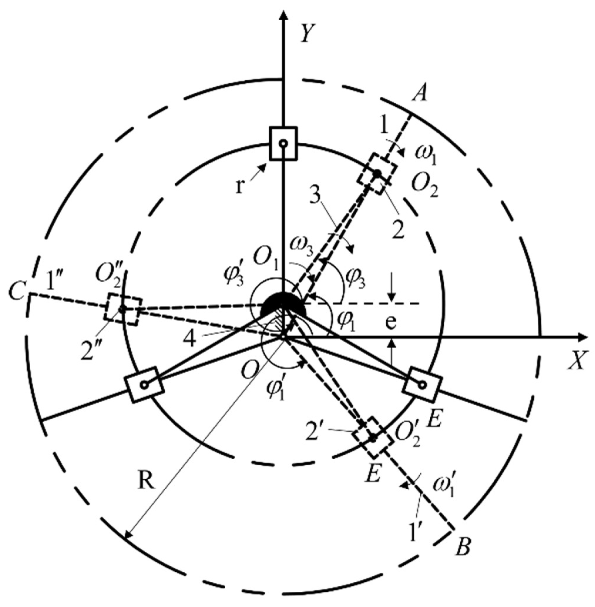 O, where the eccentricity vector aligns with the positive Y-axis. The solid lines, dashed lines, and dot-dashed lines represent the initial position, the position after the rotation of the drive blade, and the trajectories, respectively. Accordingly, Points A, B, and C correspond to the tip positions of the three blades after rotation. The vector orientations and angular relationships are annotated in