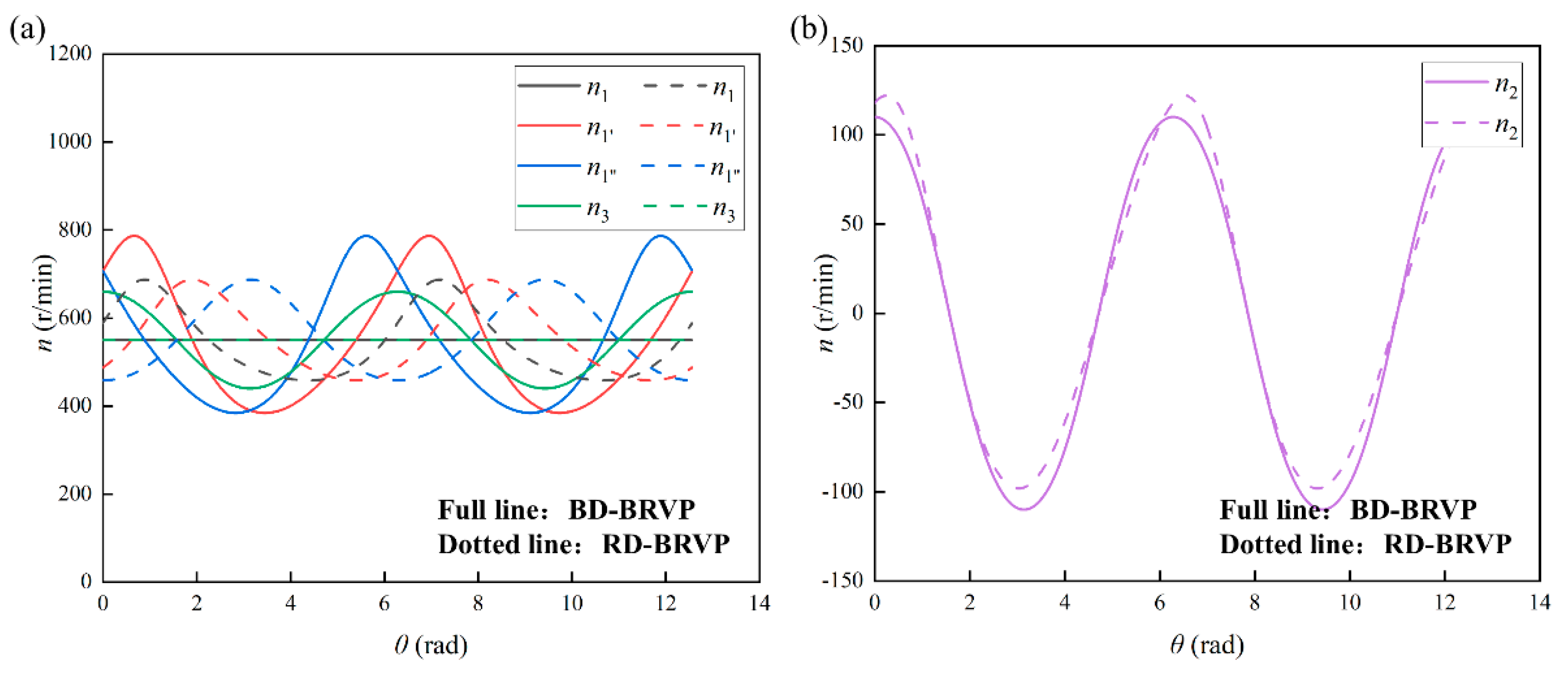 Comparison of rotational speeds of the main components of BRVPs: (a) blades and rotors; (b) sliders.
