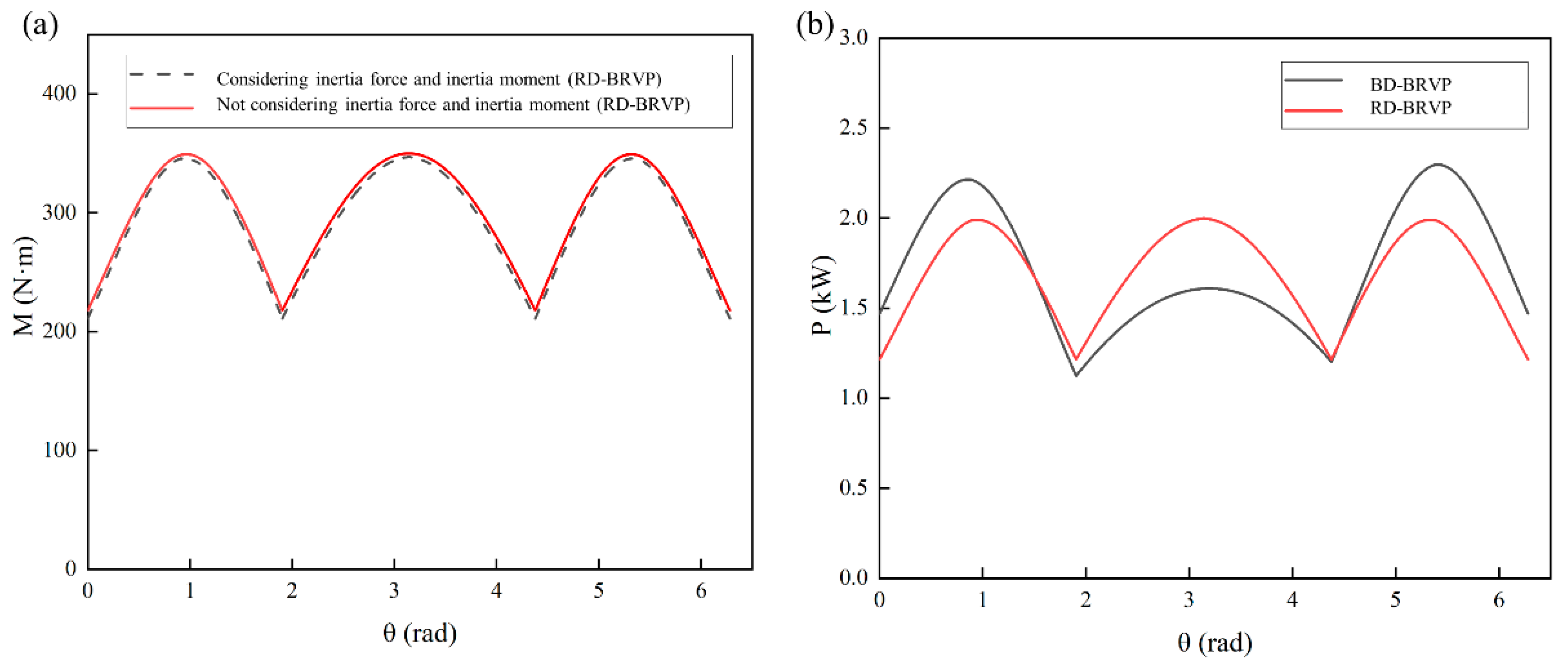 Mechanical characteristics of the main shaft of the RD-BRVP: (a) driving moment; (b) comparison of power consumption of RD-BRVP with the BD-BRVP.