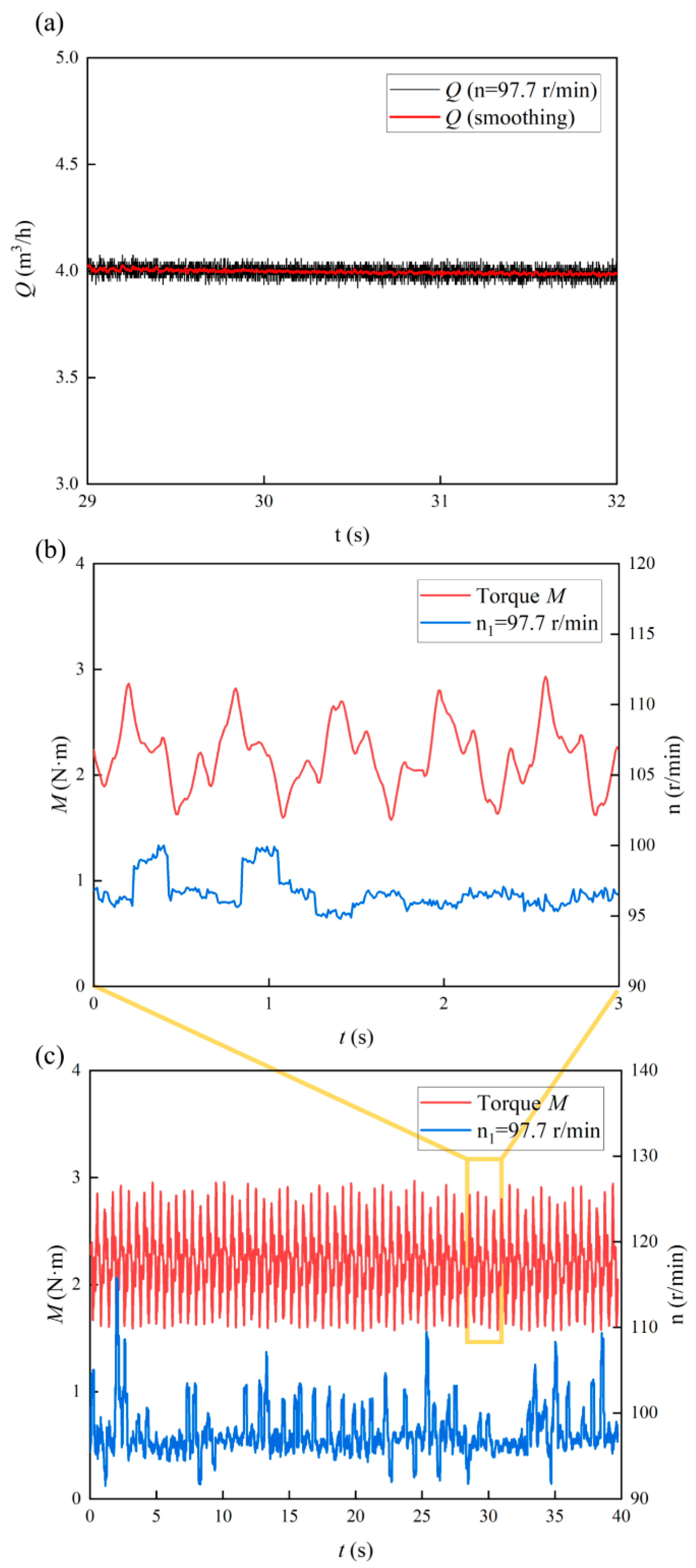 Spindle torque curve of BD-BRVP with time (n1 = 97.7 r/min): (a) instantaneous flow, (b,c) spindle torque.