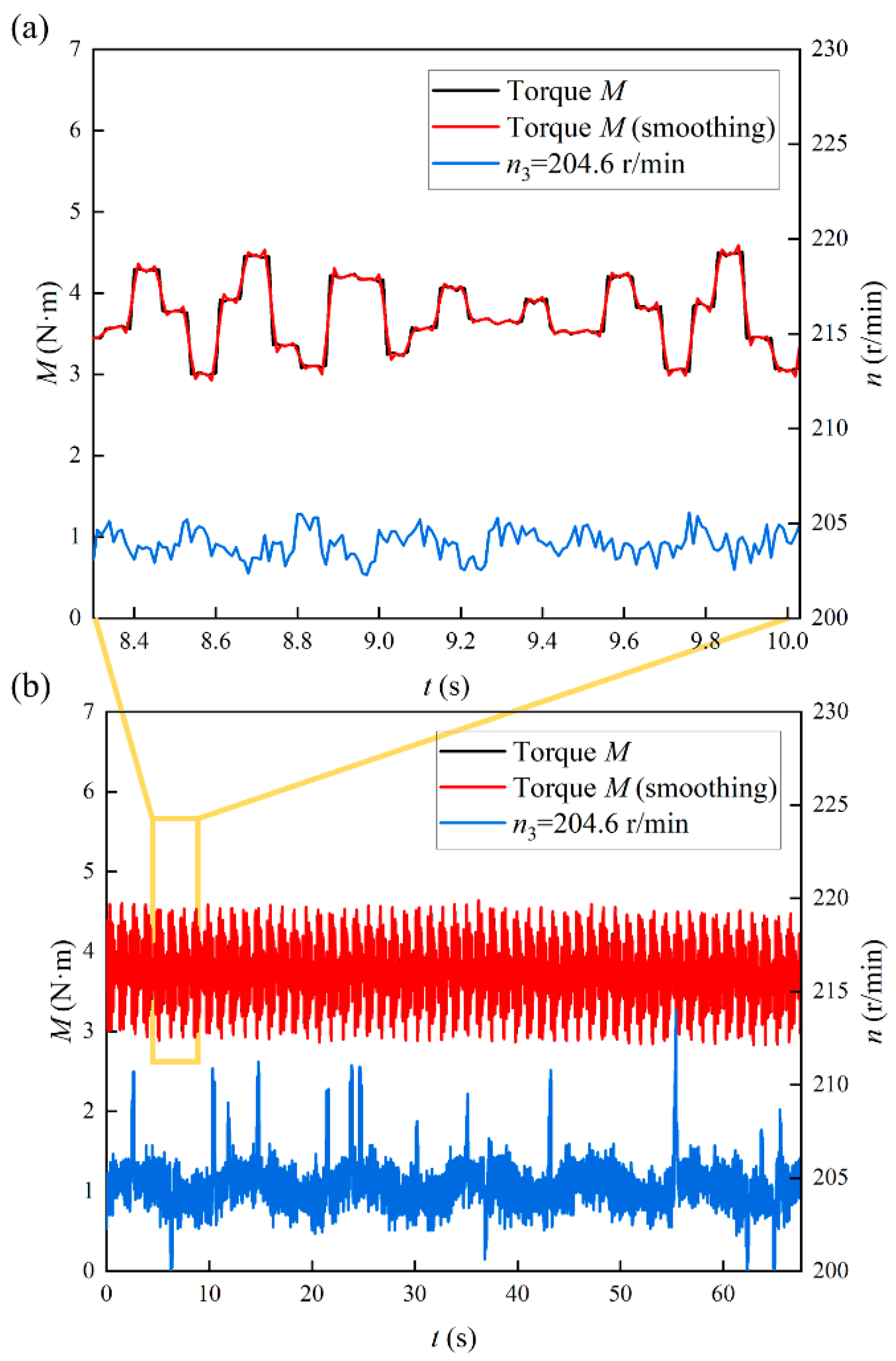 Spindle torque curve of RD-BRVP with time (n3 = 204.6 r/min): (a,b) spindle torque.
