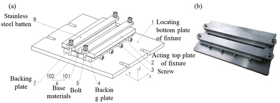 FSW is very demanding on welding fixtures [28]. In the process of FSW, it is not only required that the fixture has high stiffness and heat resistance, and the welded part has extremely high holding forces, but also when the T-joint is welding, the thin plate and the stringer need to be aligned and fixed firmly to prevent deviation in the welding. Therefore, Figure 2a is a schematic diagram of a specialized fixture designed specifically for this FSW experiment, and the corresponding physical drawing is shown in Figure 2b.