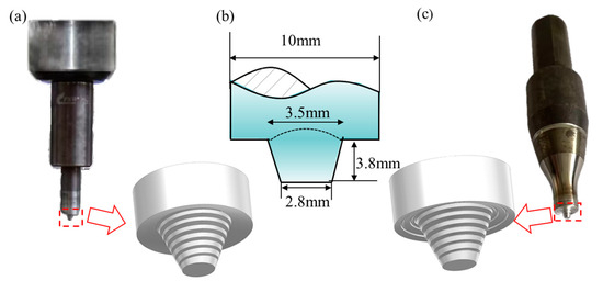 Welding speed (v), rotational speed (w), insertion depth (h) and stirring tool structure have an important influence on the forming and mechanical properties of T-joints [29,30,31]. The welding pins were designed as conical thread structures, but the difference was that the stirring tool shoulder structures. The first shoulder was the inner concave surface without spirals, abbreviated as ICSWOS (see Figure 3a), and the second shoulder was the inner concave surface with spirals, abbreviated as ICSWS (see Figure 3c). The diameters of the shoulders were 10 mm and the lengths of the stirring pins were 3.8 mm. The diameters of the small and large ends of the stirring pin were 2.8 mm and 3.5 mm, respectively [8]. Figure 3b presents the structure diagram of the stirring tools.