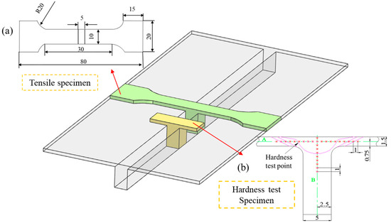 Geometric of tensile specimen for the T-shaped stiffened plate, views of loading for the test machine with (a) dimensional profile and (b) hardness test position.