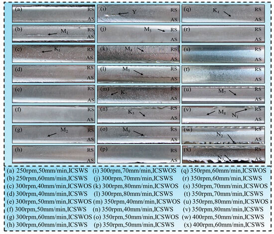 Different process parameters have a significant impact on the surface morphology of T-joints, and inappropriate heat input can lead to deteriorated joint performance. When the heat input is too low, the plasticization of materials is insufficient, and it cannot flow adequately. When the heat input is too high, the material is excessively plasticized, resulting in the formation of a large number of flashes on the weld seam surface [33]. Figure 5a–x, respectively, show the surface morphology of joint welds obtained under conditions of w = 250 rpm, w = 300 rpm, w = 350 rpm, and w = 400 rpm, with their defect types listed in Table 4. For convenience of description, K, M, Y, and N represent roughness, groove, channel, and flash defects, respectively, with subscripts indicating inconsistencies in the severity of joint weld defects. From Figure 5, it can be observed that the surface morphology of welds in Figure 5d,f,h,j,l,n,p,r,t is significantly better than the corresponding Figure 5c,e,g,i,k,m,o,q,s, respectively. This phenomenon demonstrates that welds produced using the ICSWS structure exhibit fewer defects than those created with the ICSWOS structure. This improvement stems from the shoulder’ s enhanced heat generation, which arises from dual thermal mechanisms: frictional heating and plastic deformation heat. According to the frictional heat formula: