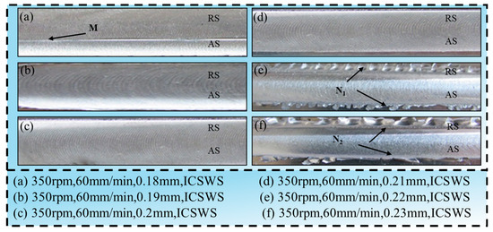 When the w is 250 rpm, and the insertion depth h and v are 0.21 mm and 60 mm/min, respectively, joints welded using the ICSWS structure exhibit poor surface formation, characterized by groove M1, as shown in Figure 5b. This occurs because the excessively low w results in insufficient heat input and relatively inadequate frictional heat generation, leading to poorer flow characteristics and higher viscosity of the plasticized material. When using the ICSWS shoulder structure with parameter combinations of [300 rpm, 40~60 mm/min, 0.21 mm] and [350 rpm, 40~70 mm/min, 0.21 mm], the weld surface quality is good. However, when v increases to 70 or 80 mm/min, the joint surface formation deteriorates, showing grooves M3, M5, M8, and flash N1, as seen in Figure 5j,l,v, respectively. The occurrence of these phenomena is attributed to the constant w, where excessively high v reduces the welding line energy, resulting in uneven and insufficient stirring of the weld zone. When w is increased to 400 rpm, h is 0.21 mm, v is 50 or 60 mm/min, and tool structure is ICSWS exhibit numerous flashes N2 and N3 on the surface (see Figure 5w,x). This is because the excessively large w dramatically increases the heat input, causing the alloy material to be fully plasticized, carried from the AS to the RS, and ultimately overflow occurs, forming flashes [15].