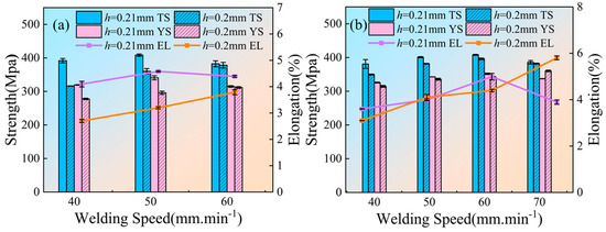 Based on the surface and internal morphology results presented above, the weld morphologies are favorable for specimens with the ICSWS shoulder structure under the parameter combinations of [350 rpm, 40~70 mm/min, 0.21 mm], [300 rpm, 40~60 mm/min, 0.21 mm] and [350 rpm, 60 mm/min, 0.20~0.21 mm]. Accordingly, tensile testing was performed on specimens with the parameter combinations [350 rpm, 40~70 mm/min, 0.20~0.21 mm] and [300 rpm, 40~60 mm/min, 0.20~0.21 mm], with the tensile results shown in Figure 8. As seen from Figure 8a, when w = 300 rpm, the tensile strength (TS), the yield strength (YS), and the elongation (EL) of the joint with h = 0.2 mm increase with the increase in welding speed v, while the TS, YS, and EL of the joint with h = 0.21 mm show a trend of first increasing and then decreasing with v. Clearly, the mechanical performance of the joint with h = 0.21 mm is superior to that of h = 0.2 mm. Further analysis reveals that when v = 50 mm/min, TS, YS, and EL reach their maximum values at 410 MPa, 341 MPa, and 4.6%, respectively.