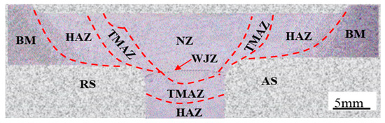 Under the action of heat input, the heat source of the T-joint can be divided into the following zones in order of distance from the centerline of the plate thickness: the NZ, the thermomechanical affected zone (TMAZ), the heat affected zone (HAZ), and the base metal zone (BM). At the two arc angles, there is a welding juncture zone (WJZ). The microscopic morphology image is shown in Figure 9.