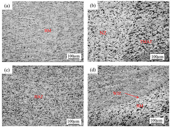 Microstructure of different regions on the T-joints: (a) BM, (b) NZ and TMAZ, (c) HAZ, (d) WJZ and BM.