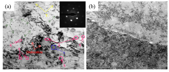 From Figure 11a, it can be observed that a small number of dislocations are detected in NZ, with abundant needle-shaped phases θ’(Al2CuMg), inclined to cross needle-shaped phase T1(Al2CuLi), pancake or rod-shaped phase η’ (MgZn2), and plate-like phase η (MgZn2) already precipitated. These precipitation-strengthening phases (metastable η phase) impede dislocation motion, thereby reinforcing the matrix and endowing NZ with higher strength and hardness. The Cu/Li ratio in the studied region of 2197-T8 alloy is 1.92 (<2), and its precipitation process of precipitates involves α (oversaturated solid solution) → G.P. zone + δ’(Al3Li) → T1 + δ’ + θ’ → T1. During the welding process of the two dissimilar alloys in NZ, since the welding temperature can reach the solidus temperature, the initial δ’ (Au3Au) and θ’ phases re-dissolve into the solid solution. After welding, cooling causes the solid solution to decompose again, resulting in the precipitation of a small amount of inclined-crossing needle-shaped T1 phase (highlighted in yellow in the figure) and abundant needle-shaped θ’ phase. Therefore, NZ represents a combined reinforcement of θ’, T1, and η, enhancing the strength and hardness of the joint.