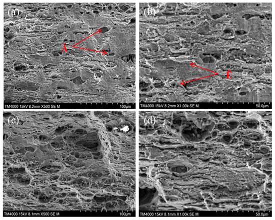 Tensile fracture morphology of T-joints with different multiples and parameter combinations of Ï: (a) 500×, (b) 1000× and Ü (c) 500×, (d) 1000×.