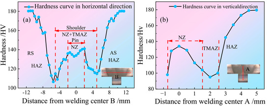 - The microhardness in the NZ correlate with precipitated phases. And along the centerline B of the weld, the T-joints exhibit a “W” distribution pattern, with the HAZ beneath the axis shoulder having the lowest hardness (106.5 Hv). Along the centerline A of the weld, the T-joints exhibit a “Z” distribution pattern, with the lowest hardness near the TMAZ.